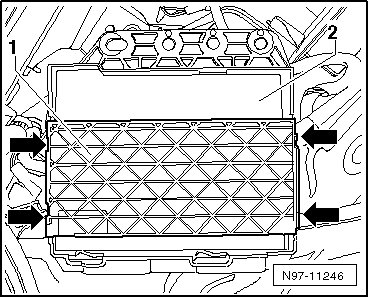 - Open the four side retainers - arrows - and remove the cover - 1 -.