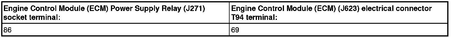 - Using a multimeter, check the Engine Control Module (ECM) Power Supply Relay (J271) to the Engine Control Module (ECM) (J623) electrical harness connector T94 for resistance.