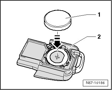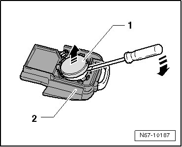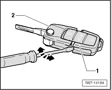 - Remove battery - 1 - in - direction of arrow - from lower part of remote control key - 2 -.