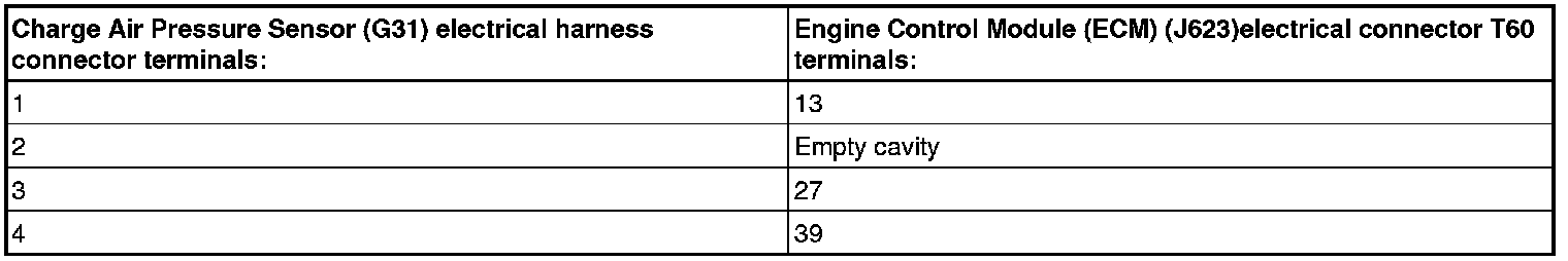 - Using a multimeter, check the Charge Air Pressure Sensor (G31) electrical harness connector terminals to the Engine Control Module (ECM) (J623)electrical harness connector terminals for an open circuit according to wiring diagram.