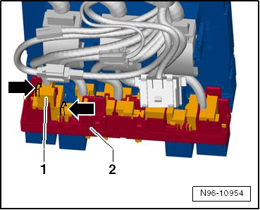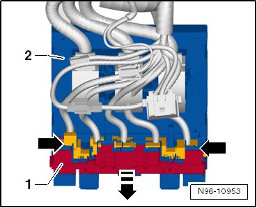 - Release both latching mechanisms - arrows - and remove the relay carrier - 1 - in the - direction of the arrow - from the vehicle electrical system control module - 2 -.