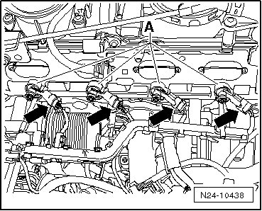 - Disconnect the Fuel Injector electrical harness connectors from Fuel Injectors (N30, N31, N32, N33)- arrows -.