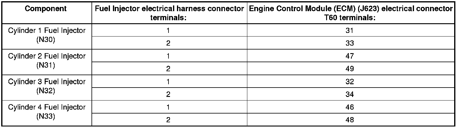 - Using a multimeter, check the Fuel Injector electrical harness connector terminals to the Engine Control Module (ECM) (J623) electrical harness connector T60 terminals for an open circuit.