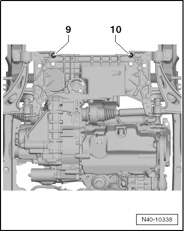 - Remove the bolts - 9 - and - 10 - and lower the subframe 10 cm maximum.