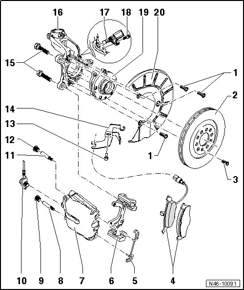 • Before removing a brake caliper or disconnecting a brake hose, the brake pedal actuator (V.A.G 1869/2) should be installed (to relieve pressure).