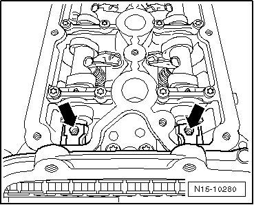 • If the threaded holes in the camshafts - arrows - do not point upward, the crankshaft must be rotated one rotation (360°) in engine rotation direction.
