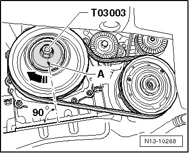 - Rotate the crankshaft in engine rotation direction until the arrow - A - on the crankshaft adapter (T03003) faces downward vertically in comparison to the engine axis. This position corresponds approximately to the crankshaft Top Dead Center (TDC) position.