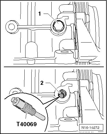 - Remove the locking pin (T40069) and install the locking bolt - 1 - to the rear of the cylinder block.