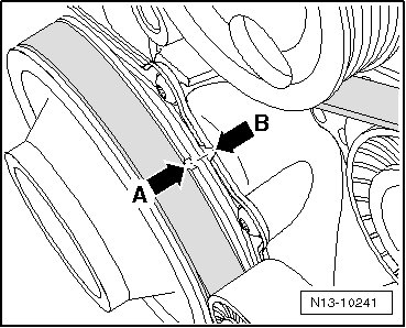• With the engine removed, the TDC mark can also be seen on the vibration damper and belt pulley side sealing flange. The notches - A and B - must align.