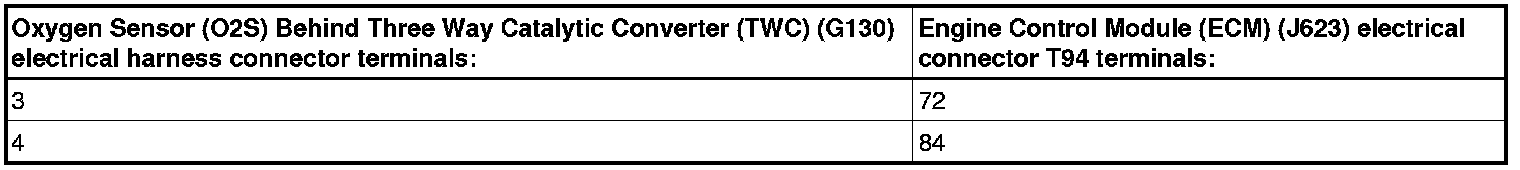 - Using a multimeter, check the Oxygen Sensor (O2S) Behind Three Way Catalytic Converter (TWC) (G130) electrical harness connector terminals to the Engine Control Module (ECM) (J623) electrical harness connector T94 terminals for resistance. Refer to Wiring Diagrams for pin locations.
