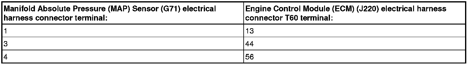 - Using a multimeter, check the Manifold Absolute Pressure (MAP) Sensor (G71) electrical harness connector to the Engine Control Module (ECM) (J220) electrical harness connector T60 for resistance. Refer to Wiring Diagrams for pin locations.