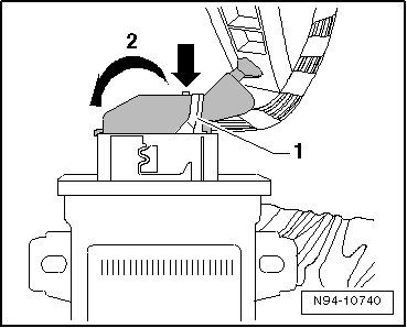 - Press the tab - arrow -, move the bracket - 1 - in - direction of arrow 2 - and disconnect the connector.