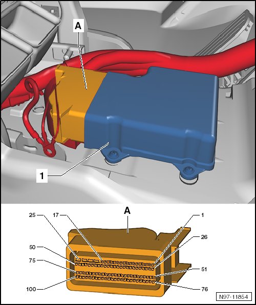 A - 100-pin connector -T100- on the wiring harness