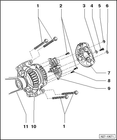 • Removing and installing voltage regulator, refer to => [ Voltage Regulator, Bosch ] Voltage Regulator, Bosch or => [ Voltage Regulator, Valeo ] Voltage Regulator, Valeo.