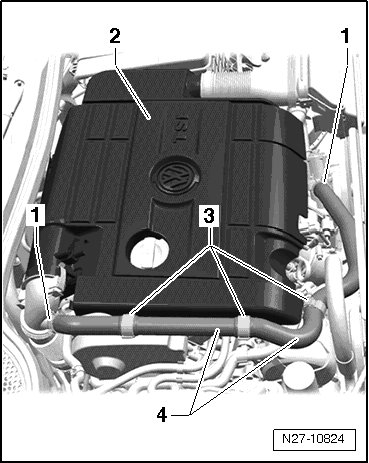 - Open the clamps - 1 - on the intake manifold - 4 - using the (V.A.G 1921) , remove the intake manifold from the intake connections and remove the intake manifold from the engine compartment.