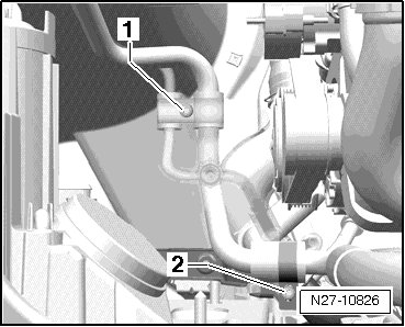 - Remove the generator - 1 - to the right in - direction of arrow - and out of the vehicle. At the same time move the loosened refrigerant lines - 2 - slightly to the side.
