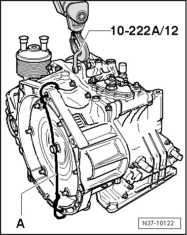 - Secure the torque converter - arrow - with wire, for example- A -, to prevent it from falling during transport.