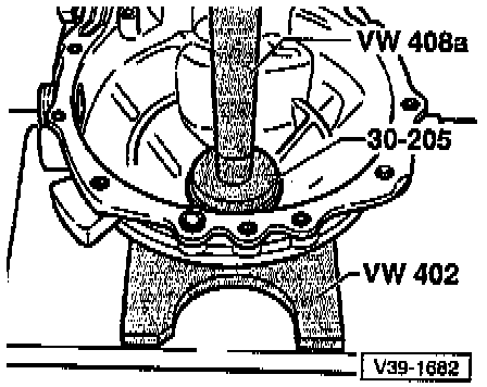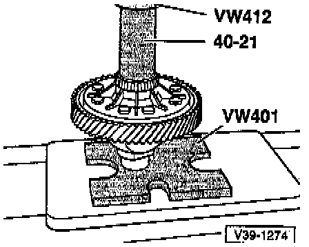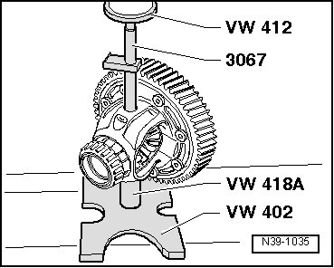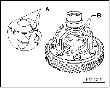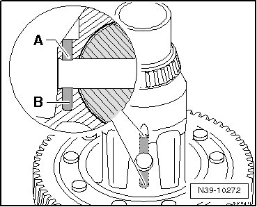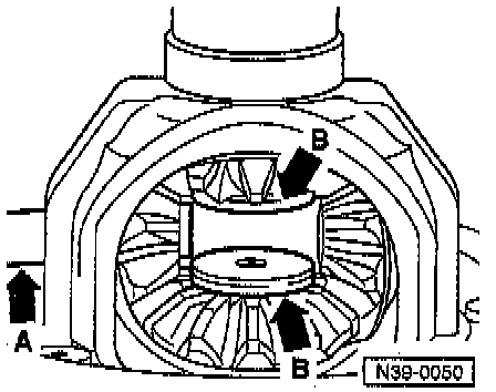 - Press the differential bevel gear - arrow A - up to the first small differential bevel gear.