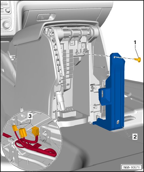 - Remove the multimedia box bracket - 2 - from the center console. Disconnect the wire harness - 3 - (depending on the vehicle equipment level).