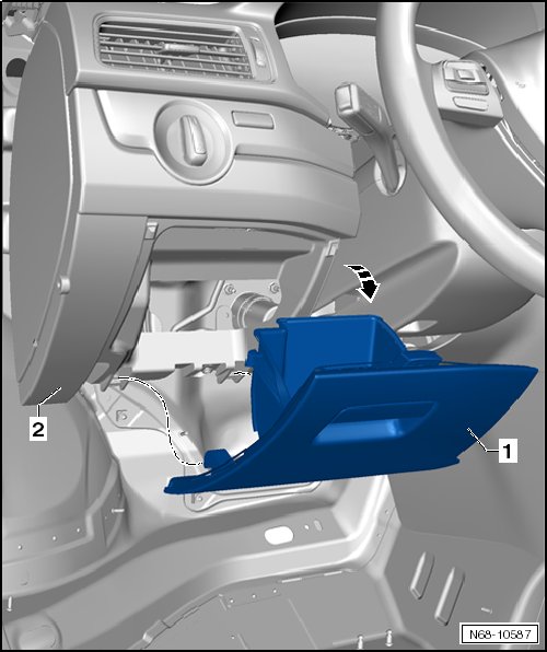 - Loosen the storage compartment on the driver side - 1 - from the upper retainers and remove it from the instrument panel - 2 -.