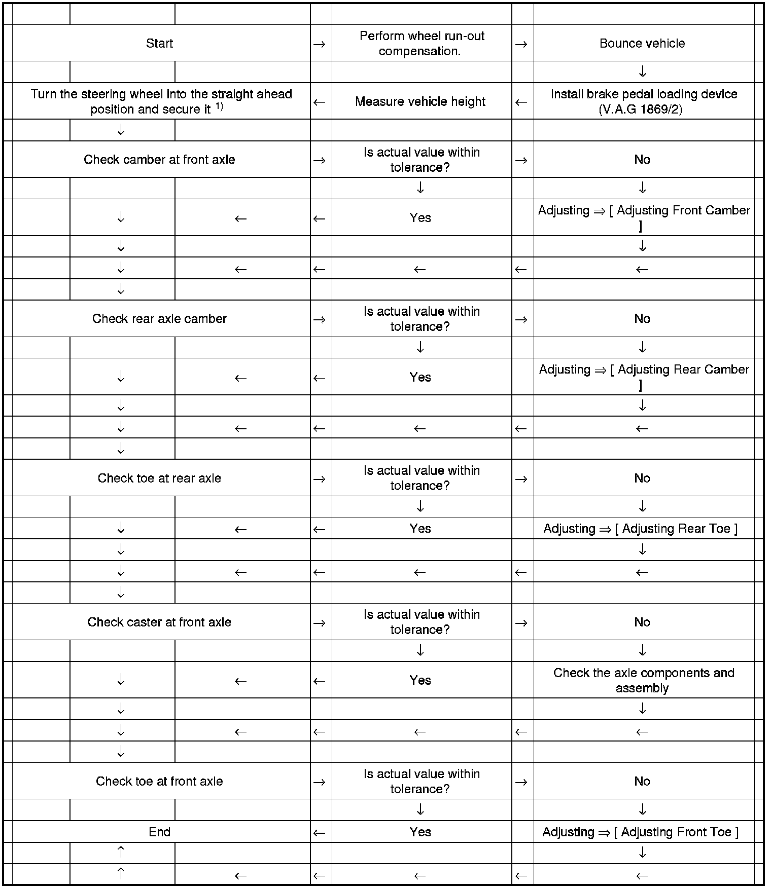1) If steering wheel is crooked at end of alignment procedure, it must be straightened. Perform a basic setting on the steering angle sensor (G85) using the Vehicle diagnostic tester.