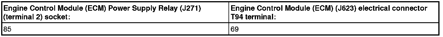 - Using a multimeter, check the Engine Control Module (ECM) Power Supply Relay (J271) to the Engine Control Module (ECM) (J623) electrical harness connector T94 for resistance.