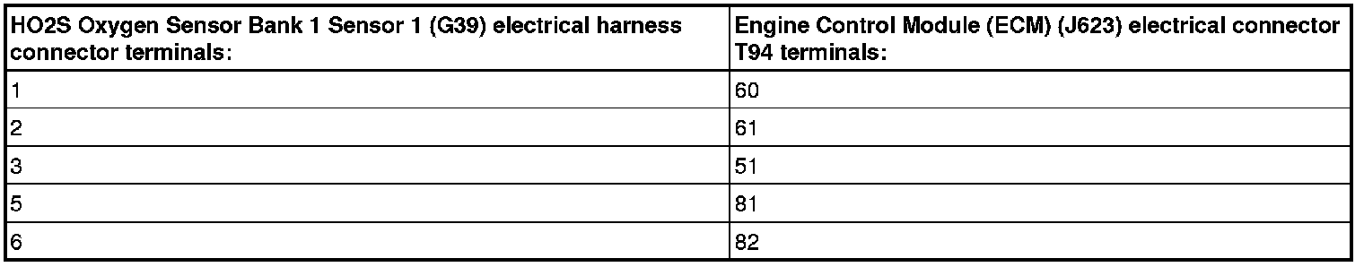 - Using a multimeter, check the HO2S Oxygen Sensor Bank 1 Sensor 1 (G39) electrical harness connector terminals to the Engine Control Module (ECM) (J220) electrical harness connector T94 terminals for an open circuit.