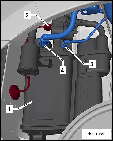 - Loosen both nuts - arrows - and remove the Evaporative Emission (EVAP) canister - 2 - downward from the bracket.