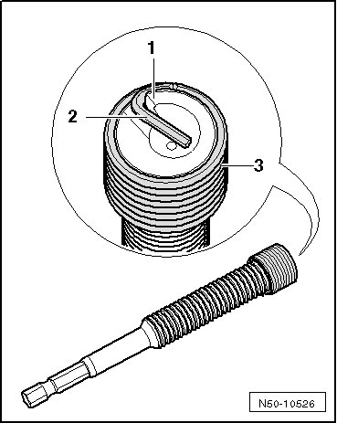 - Turn the threaded insert - 3 - onto the spindle until the drive peg - 2 - makes contact on drive tab - 1 - of installing spindle.