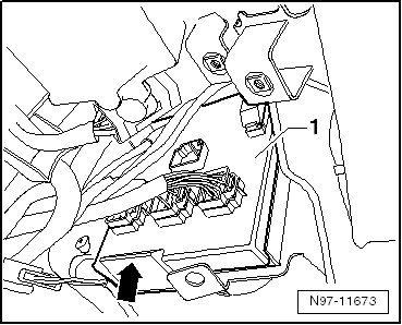 - Push the retainer - arrow - downward and remove the vehicle electrical system control module - 1 -. Pay attention to the wires still connected.