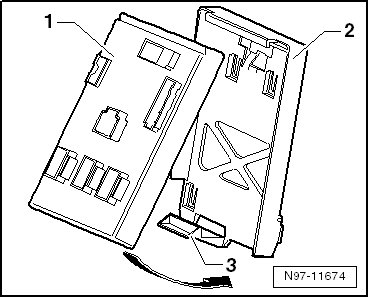 - Insert the vehicle electrical system control module - 1 - first into the upper guide - 2 - and then latch it into the lower retainer - 3 -.