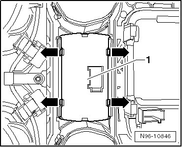 - Pull the 4 retainers in - direction of arrow - and remove the switch module- 1 - from the trim.