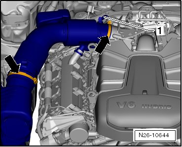 - Remove the hose - 1 -, the clamps - arrows - and the intake air duct.