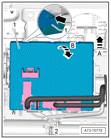 - Carefully tilt the control module - 1 - out of the tabs - 2 - in the - direction of arrow B -.