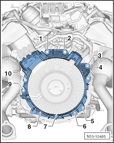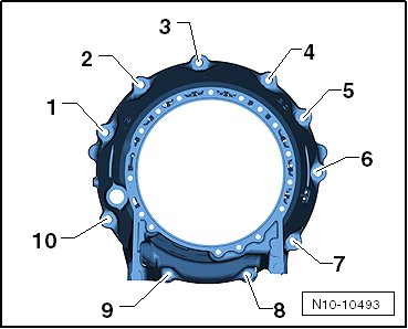 - Tighten the new bolts - 1 through 10 - that connect the transmission to the electro-drive drive motor to 30 Nm + an additional 90° (1/4) turn.