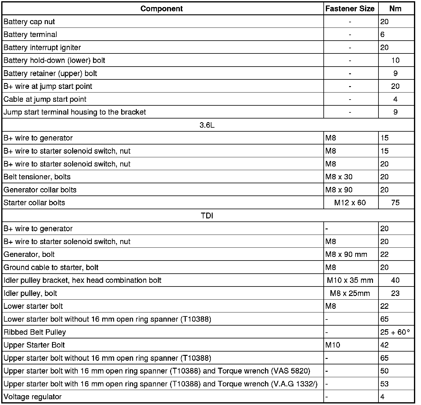 Starting and Charging: Specifications