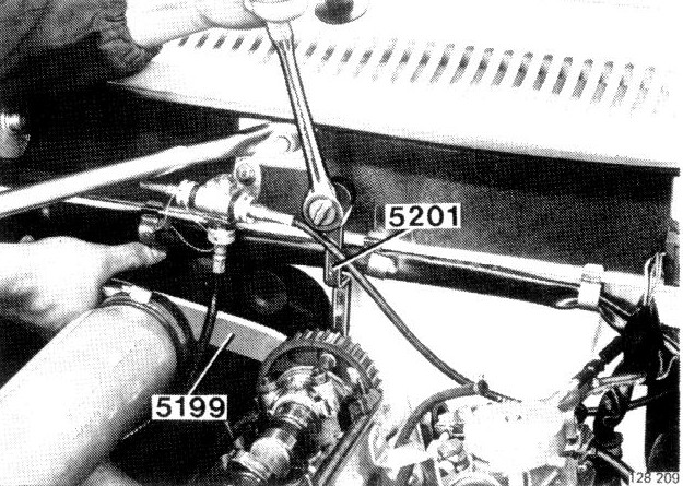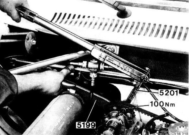 Hold sprocket in position with 5199 and unscrew nut with wrench 5201. Take care not to rotate camshaft.