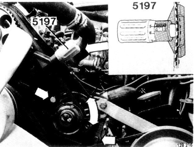 Use gauge 5197 to check belt tension. Attach gauge to belt and set to 12.5 units.