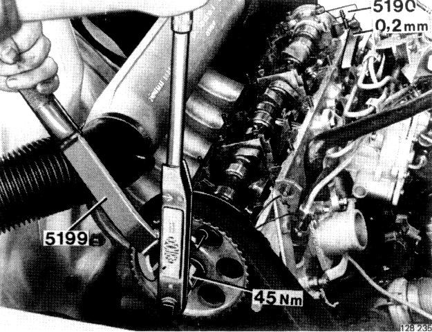 Hold sprocket in this position and torque bolt to 100 Nm (73 ft. lbs). Take care that camshaft and sprocket do not move.