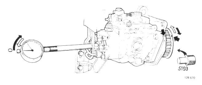 Set dial indicator zero. Lock pump gear at cyl. 1 injection using stop 5193