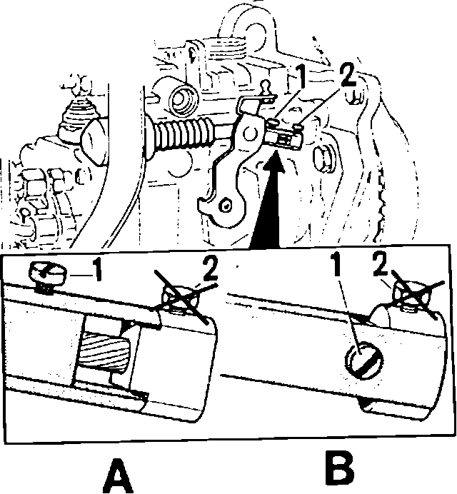 - Hold pump lever in that position and measure clearance between screw and stop for low idle speed.