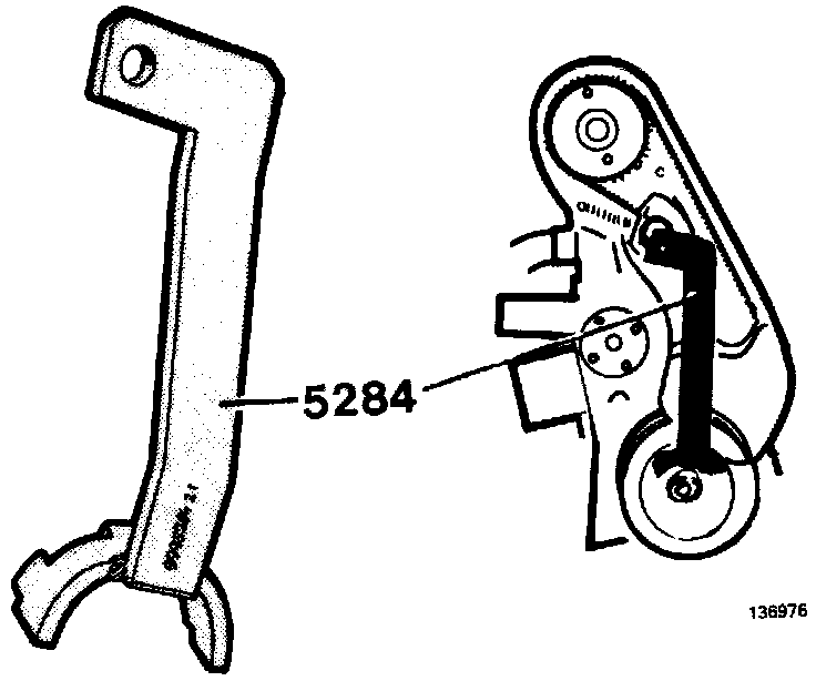 - Remove belt tensioner nut and washer. Install tool 5284.