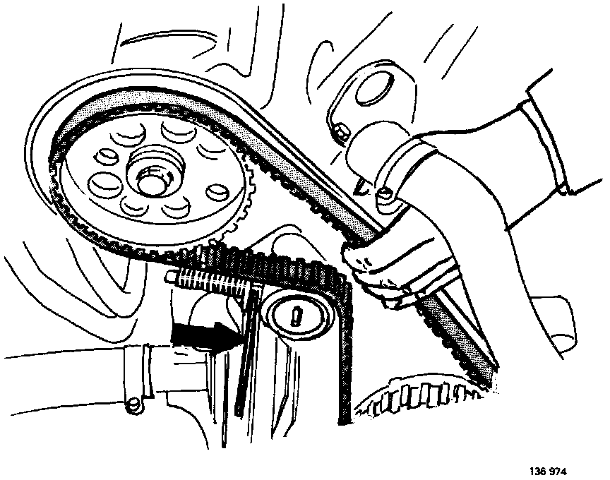 - Pull on timing belt to depress tensioner spring. Use a 3 mm drill to lock tensioner spring. Remove timing belt.