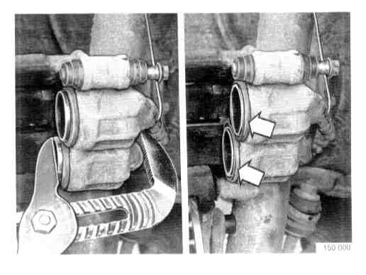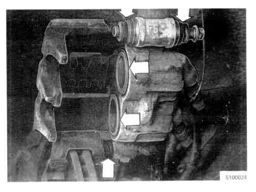 Note: Illustration shows caliper with gaiters and guide sleeves of earlier design.