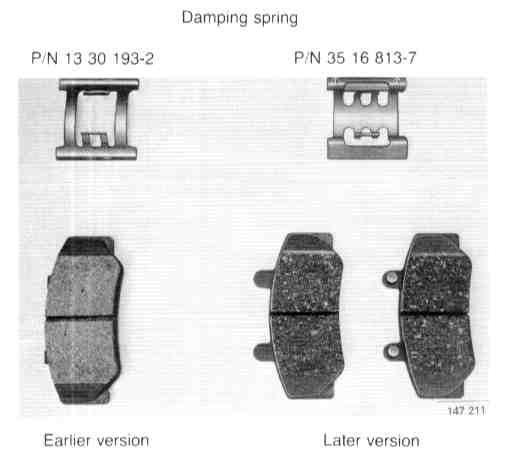 A new damping spring, P/N 3516813-7, has also been introduced. The spring must always be used with the new pads and should be installed with the arrow pointing upward as illustrated below.