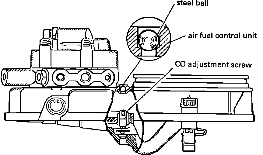CO content should be checked at test plug upstream of catalytic converter. Initial CO-adjustment is made at the factory and should not need to be changed. The access hole to the CO-screw is sealed with a steel ball. Fig. 250 If CO is not within specifications (see emission sticker or "SPECIFICATIONS"), and all other causes for incorrect CO readings have been checked, follow the adjustment procedure as described below.