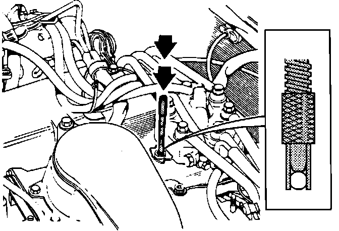 13. Check and adjust CO content. CO content can be 0.7 - 1.3 %, set CO to 1.0 % if adjustment is necessary. Fig. 387. Use VOLVO tool #5102 or equivalent. Cover the adjusting hole and rev the engine briefly between adjustments, when taking CO readings.
