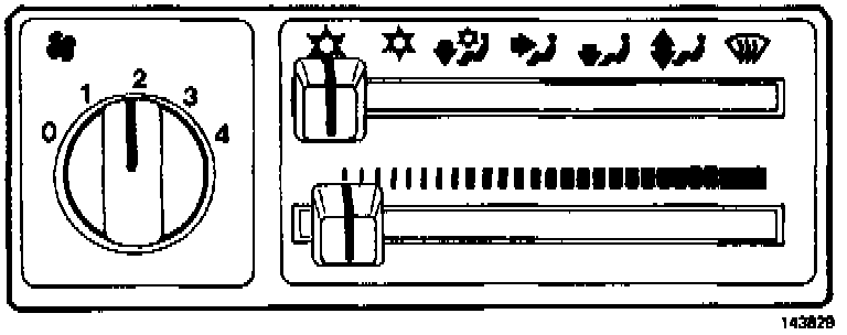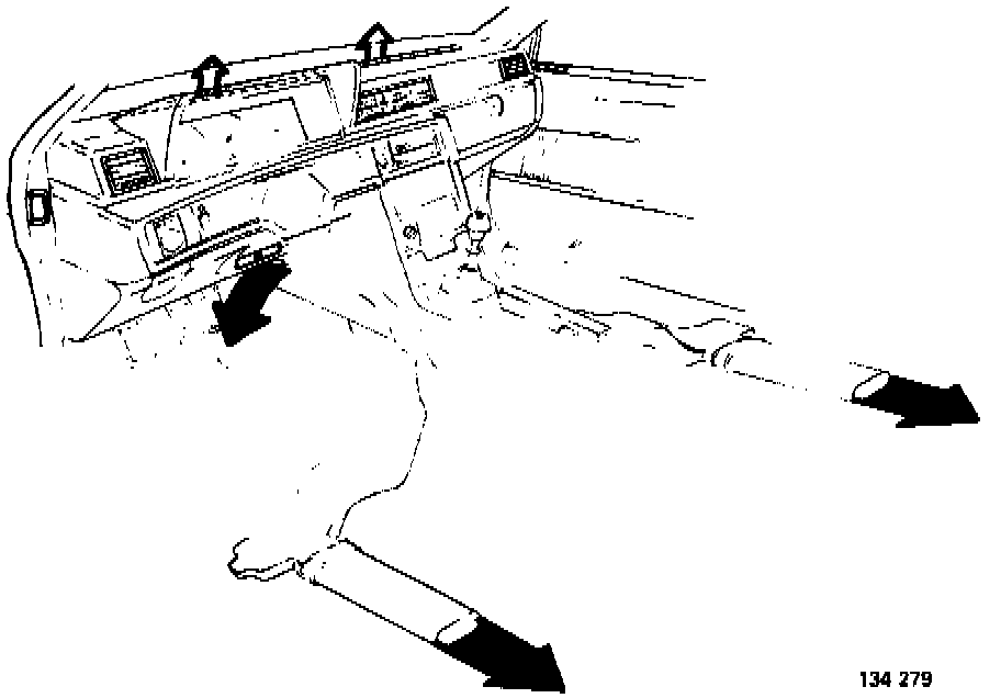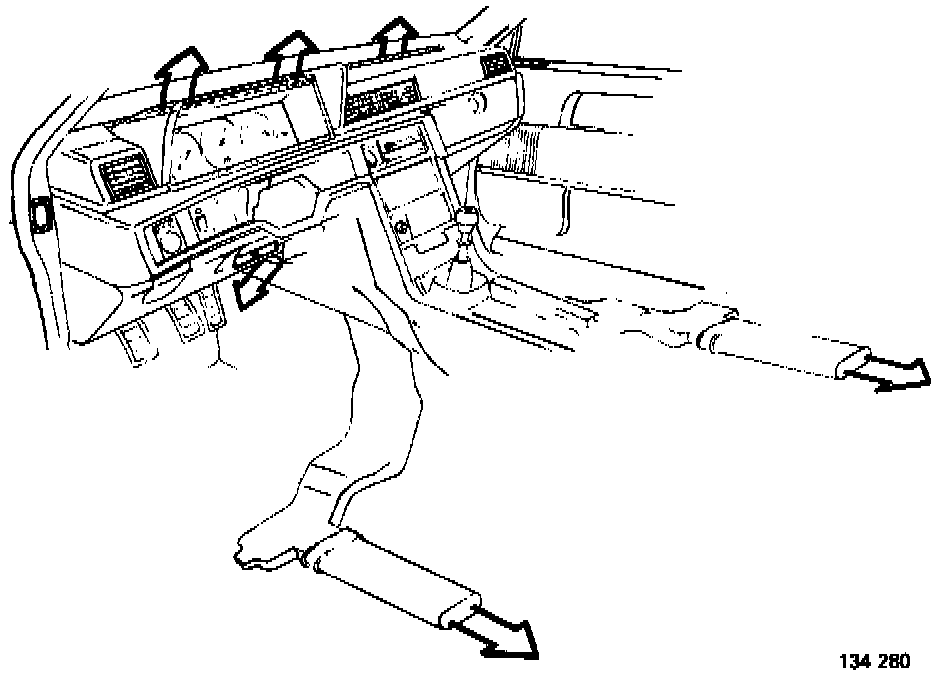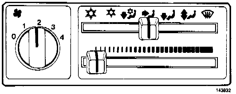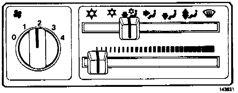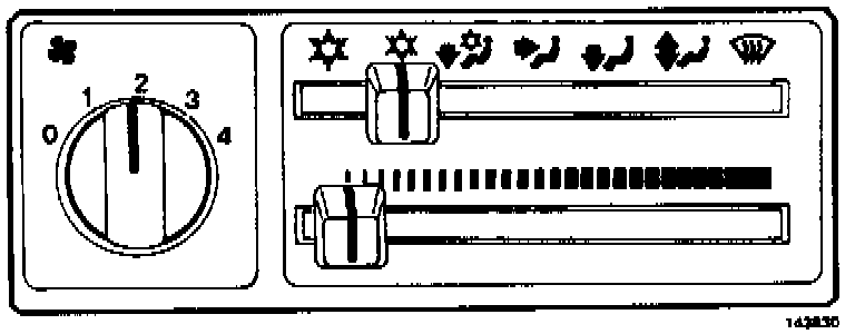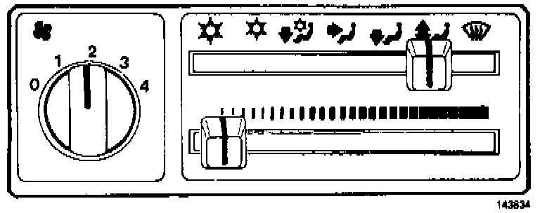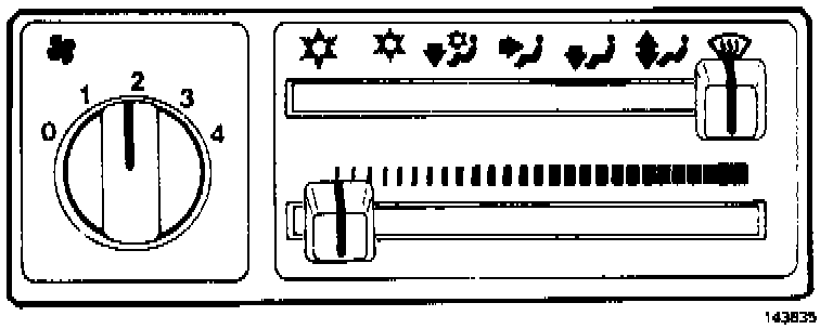 Air from floor and defroster vents. Compressor disengaged.