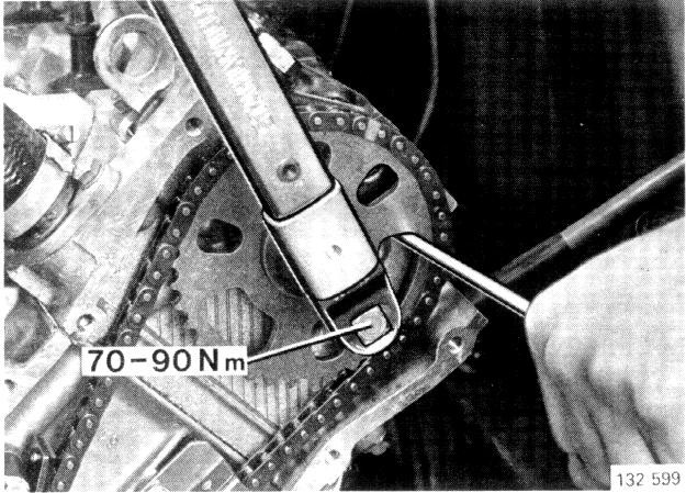 Tighten to a torque of 70-90 Nm (52-66 ft lb). Use a screwdriver to counterhold.