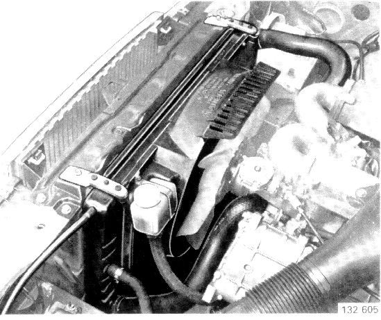 Install radiator and secure fan shroud and fluid reservoir for power steering.